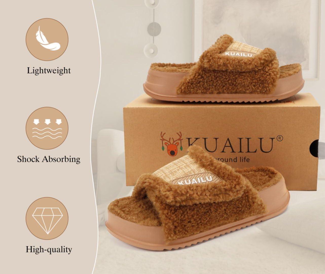 KuaiLu Cushion Slippers For Women with Orthotic Arch Support Wide Adjustable Open Toe Furry Fur Sandals Warm Teddy Fleece Recovery Slides Slip On House Shoes Indoor Outdoor Outfits