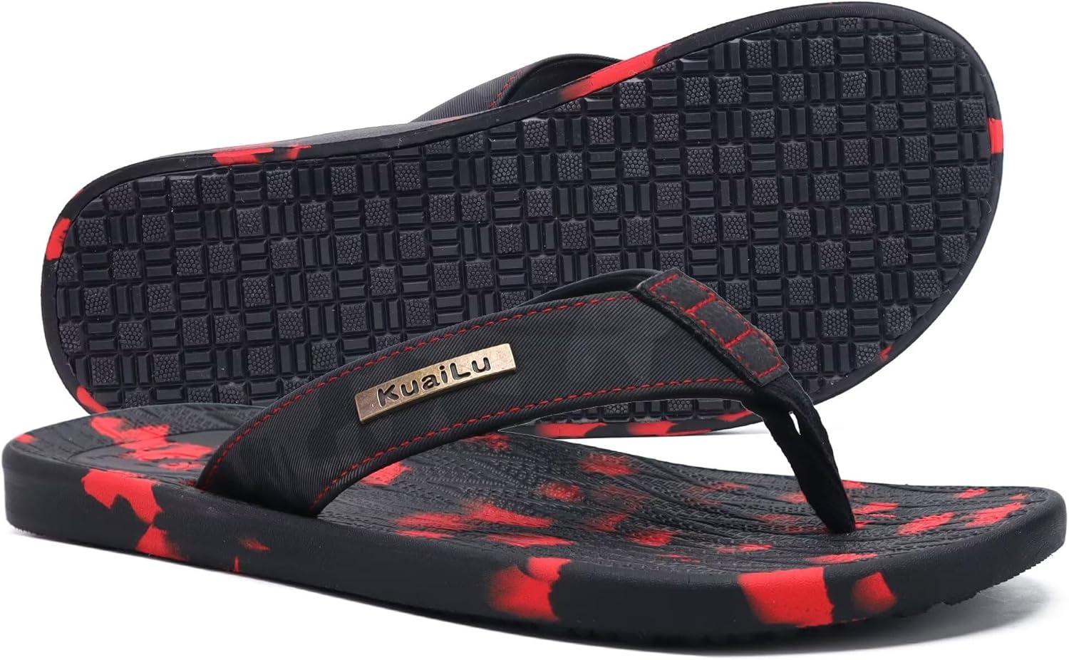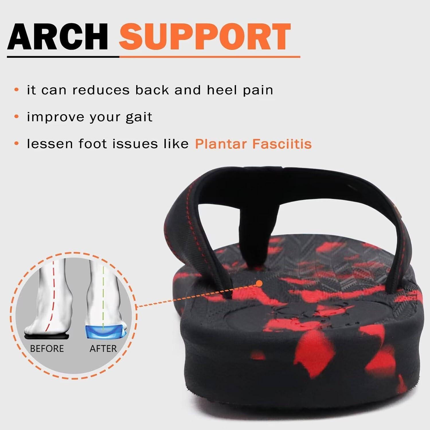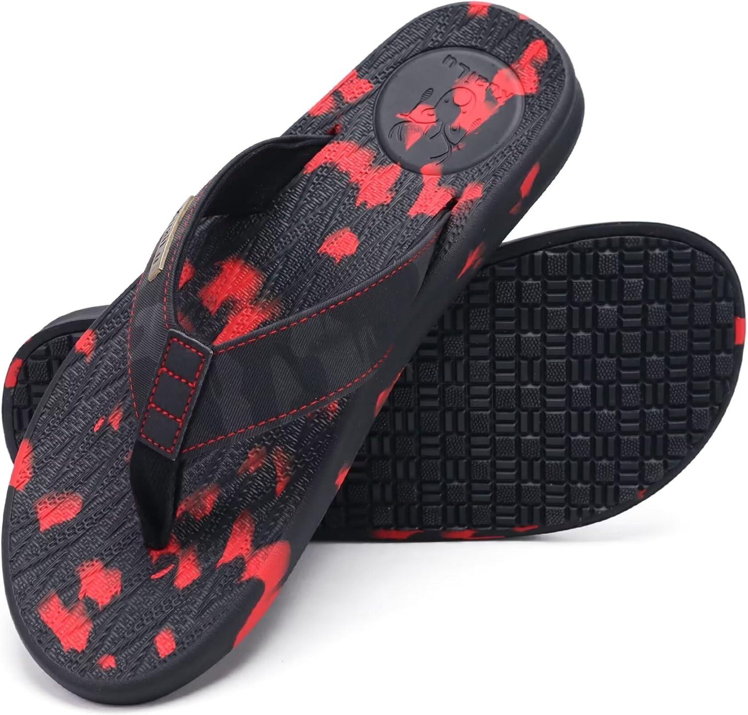 KuaiLu Mens Flip Flops Arch Support Comfortable Summer Beach Thong Sandals Yoga Foam Cushion Slip on Slippers(Camo-blackred)