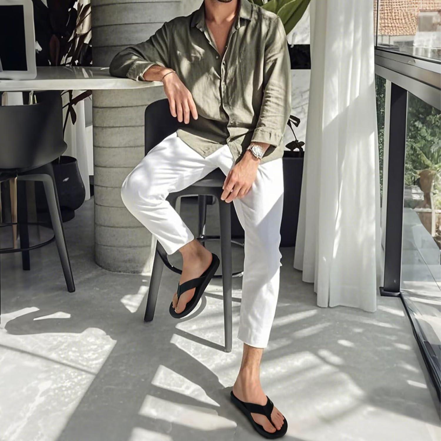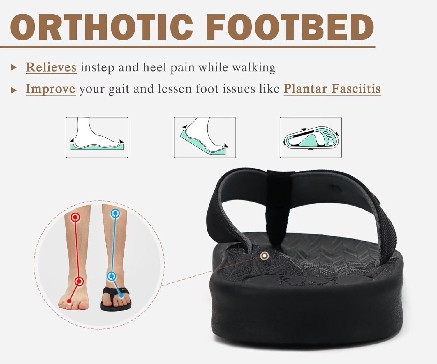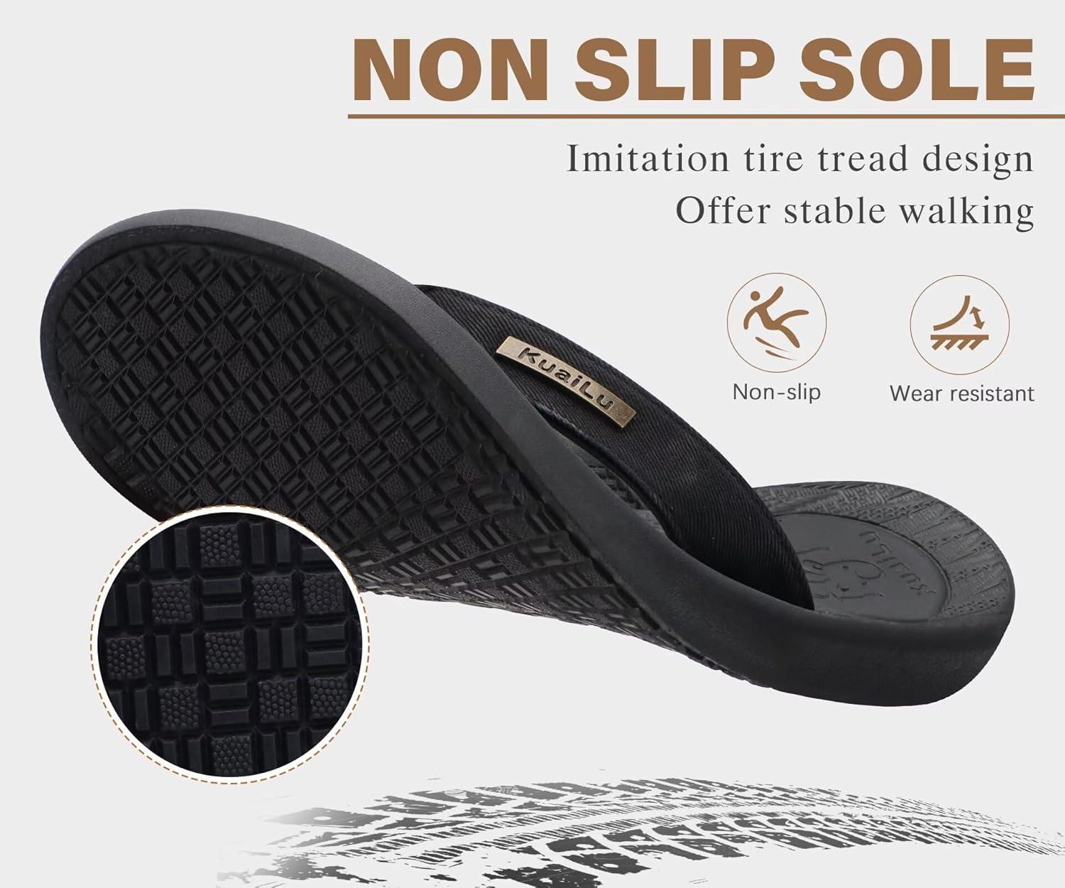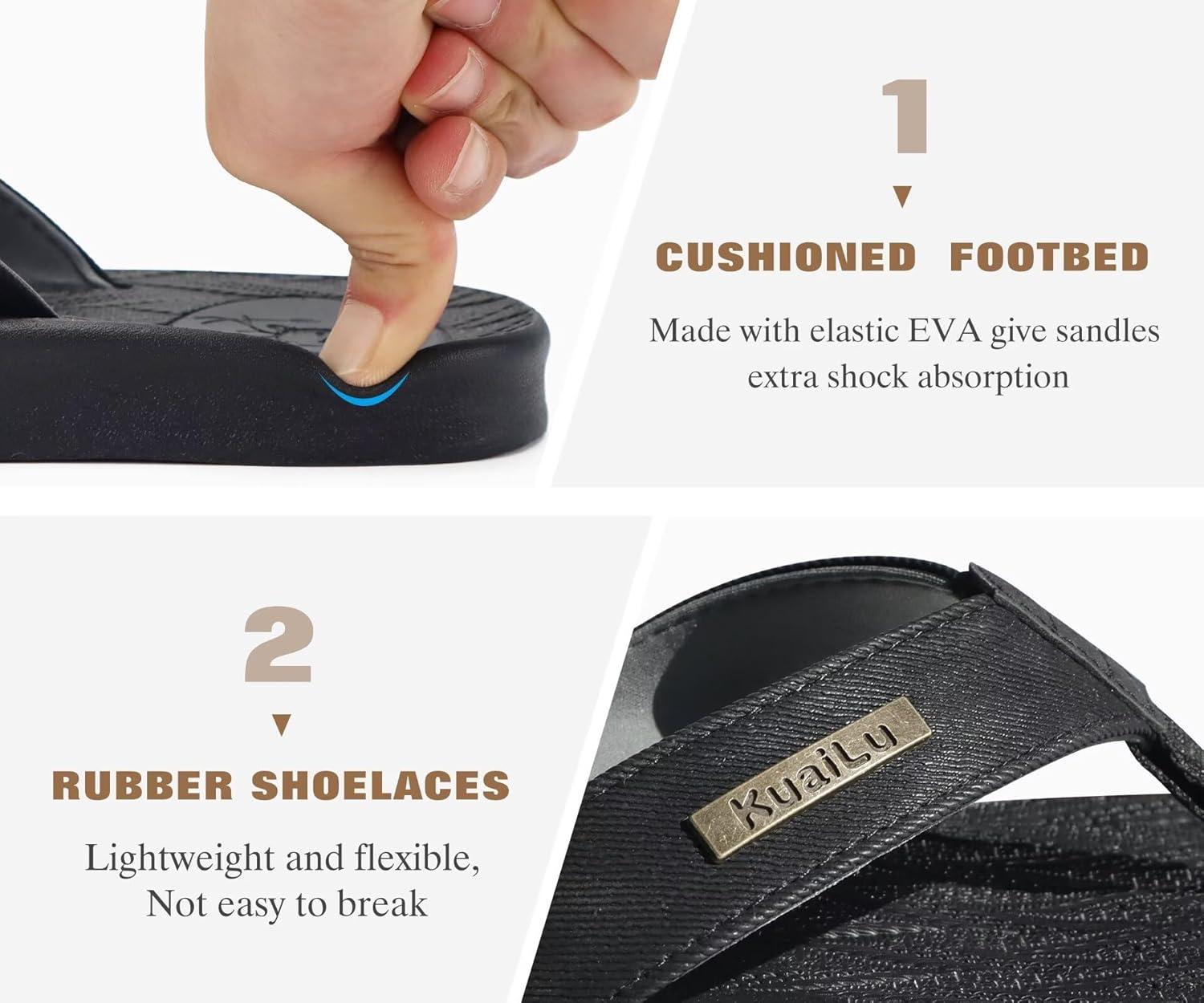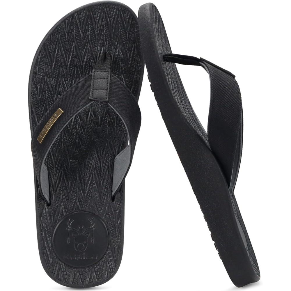 KuaiLu Mens Flip Flops Arch Support Comfortable Summer Beach Thong Sandals Yoga Foam Cushion Slip on Slippers(Pu-black)