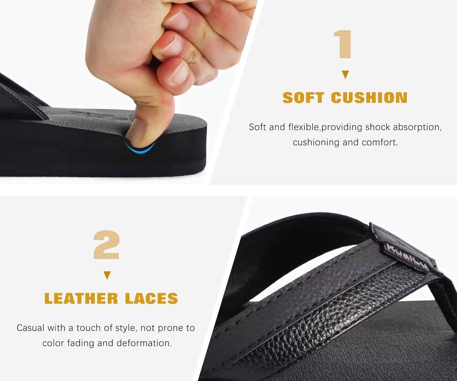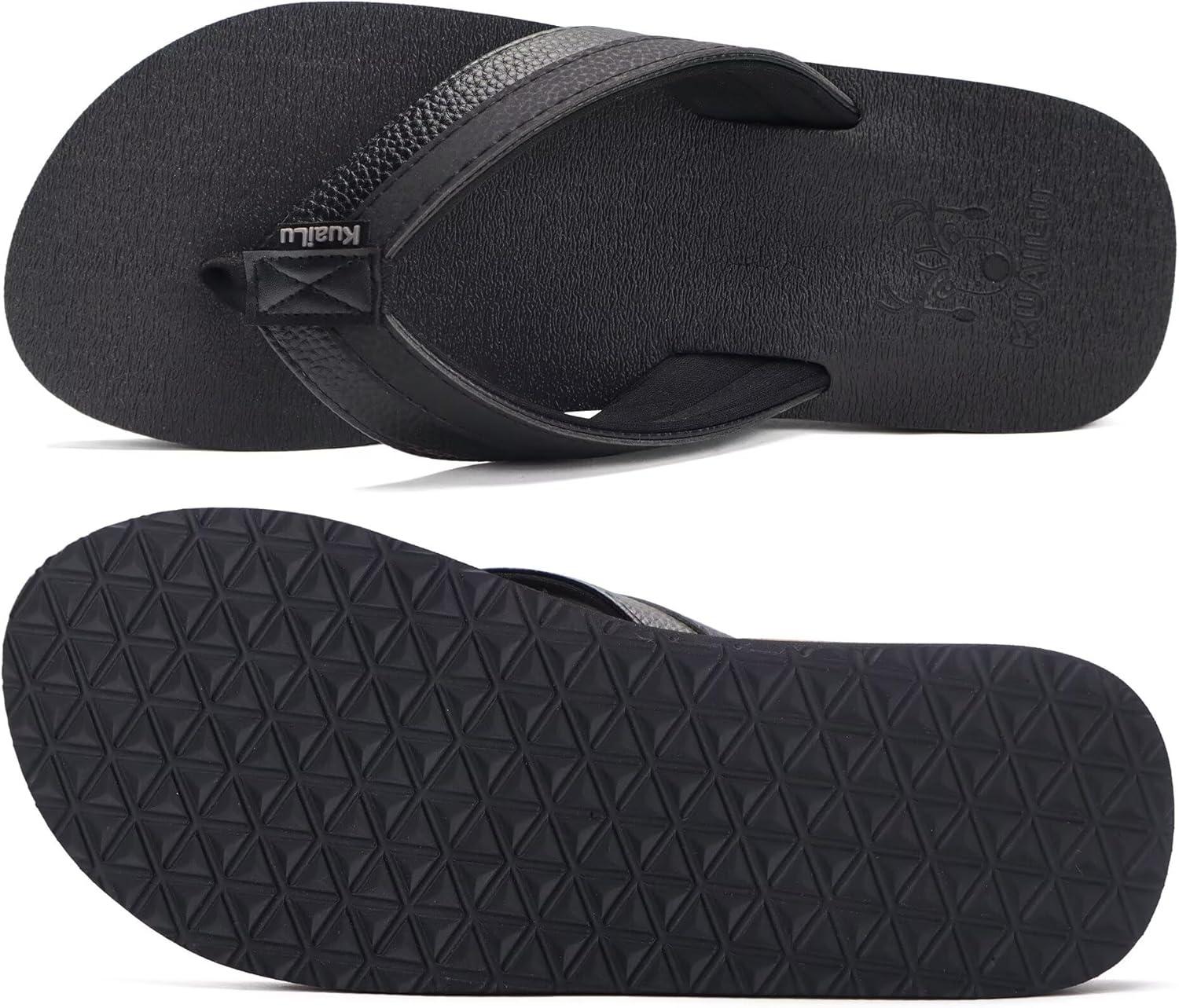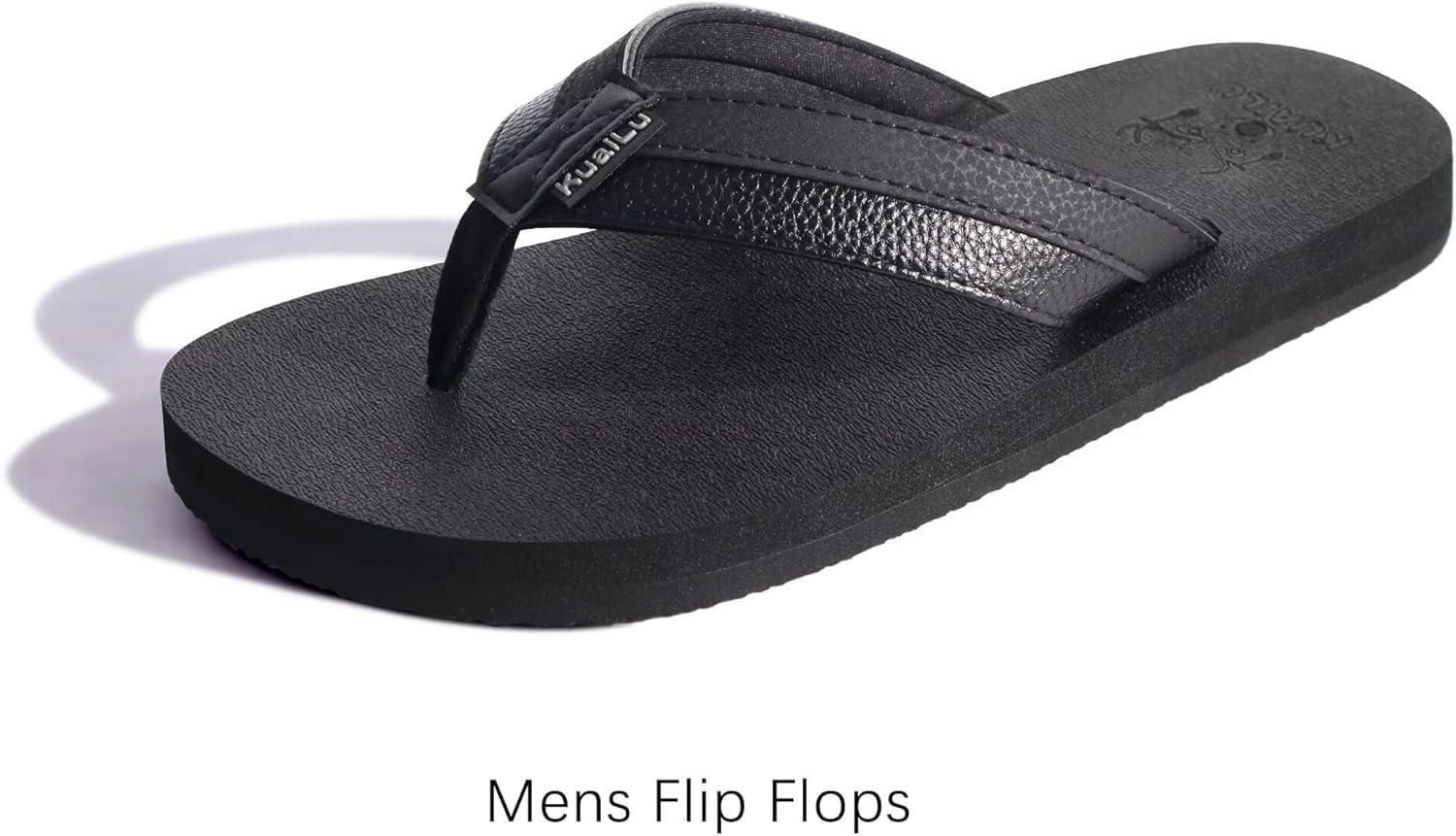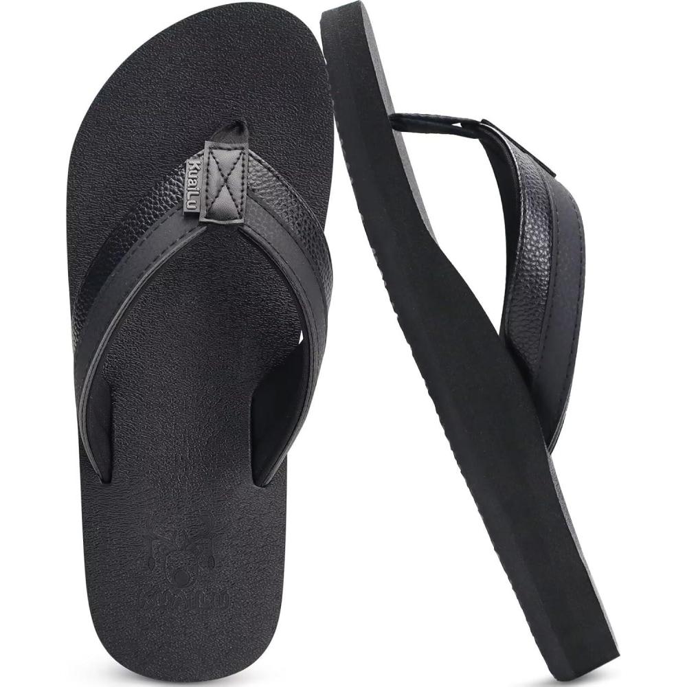 KuaiLu Men’s Yoga Mat Leather Flip Flops with Arch Support Comfortable Cushion Walking Thong Sandals Slip On Indoor Outdoor(All Black)