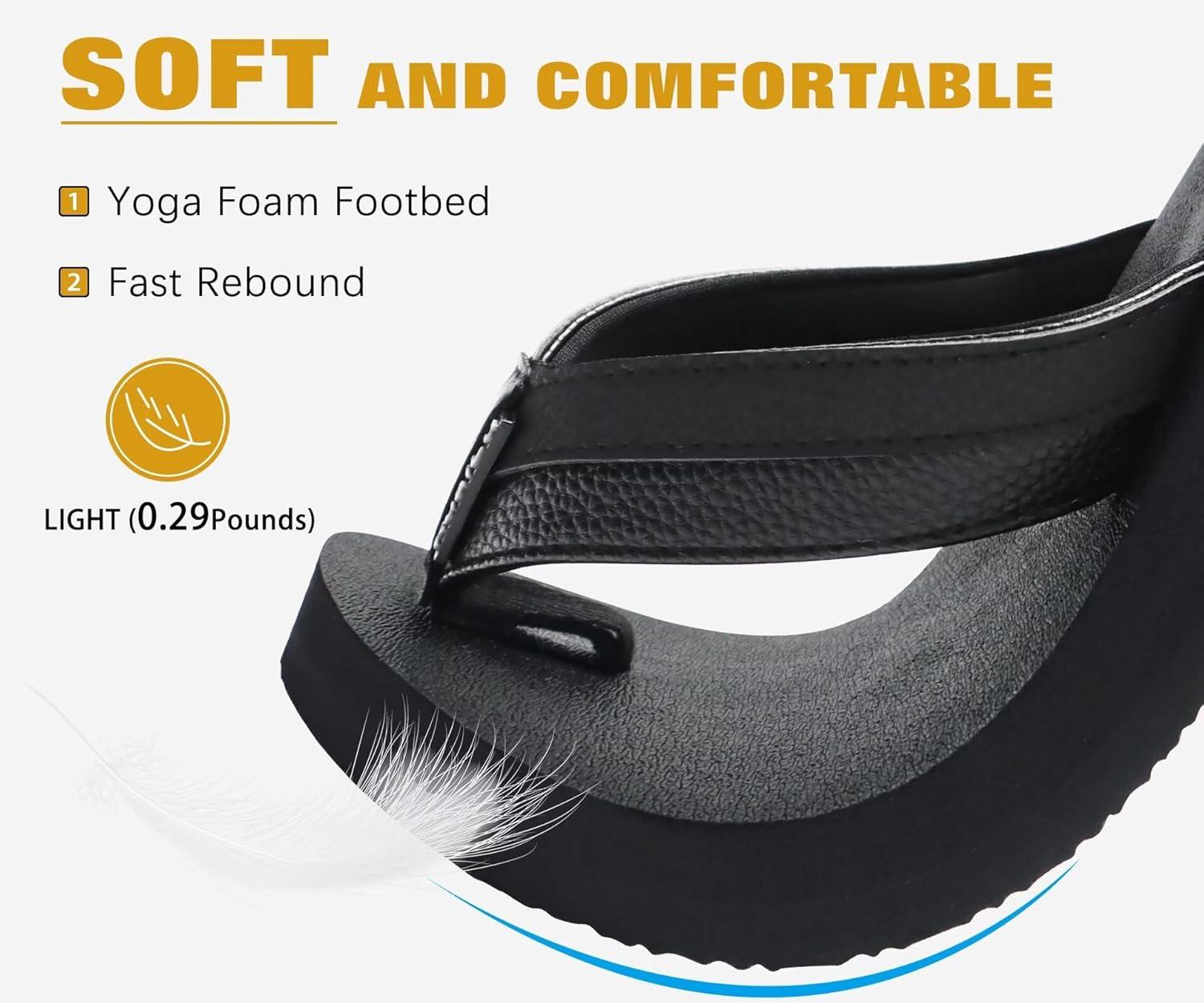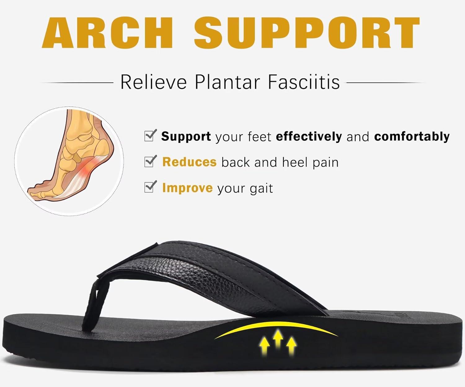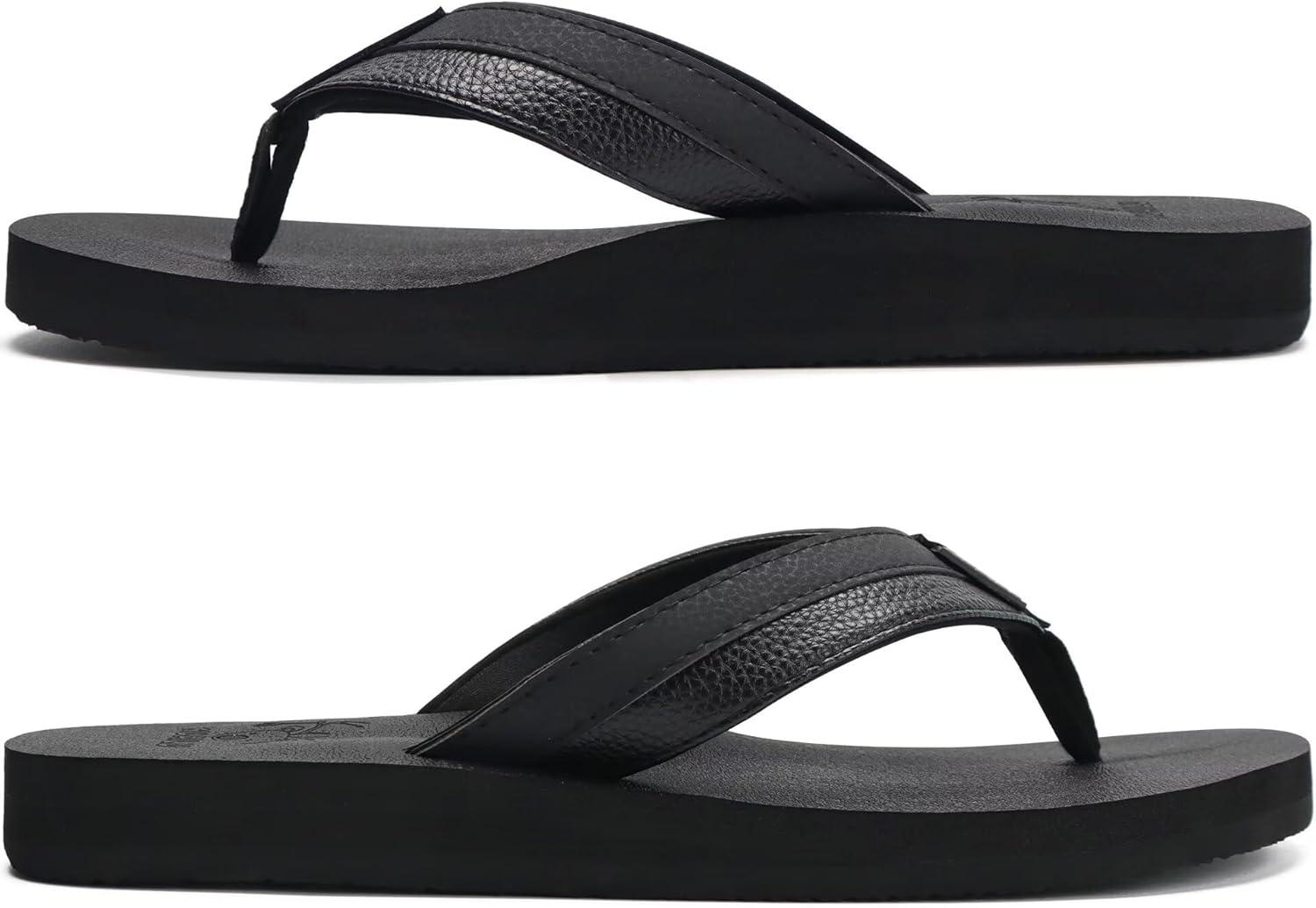 KuaiLu Men’s Yoga Mat Leather Flip Flops with Arch Support Comfortable Cushion Walking Thong Sandals Slip On Indoor Outdoor(All Black)