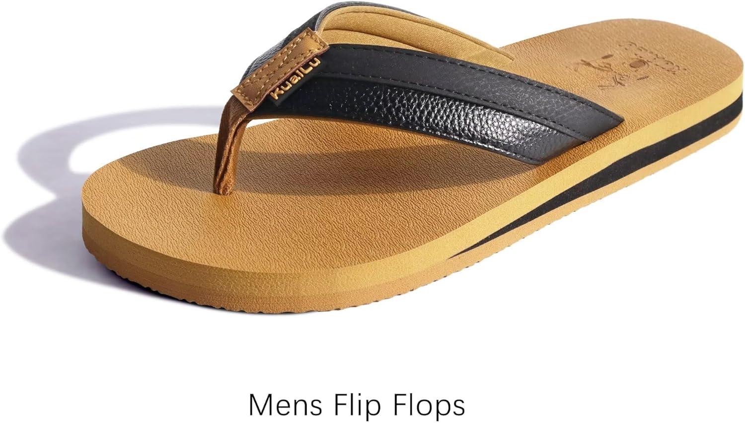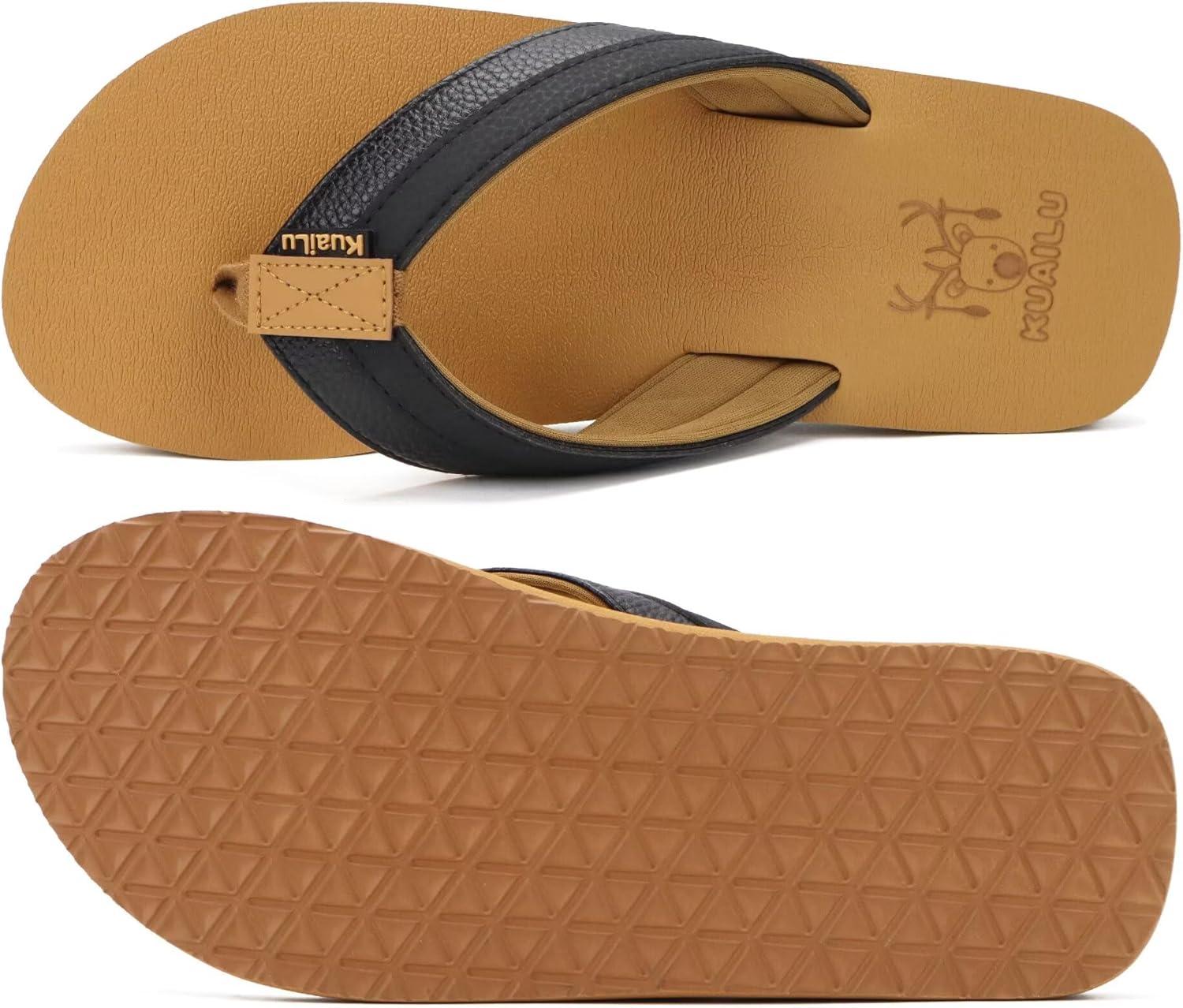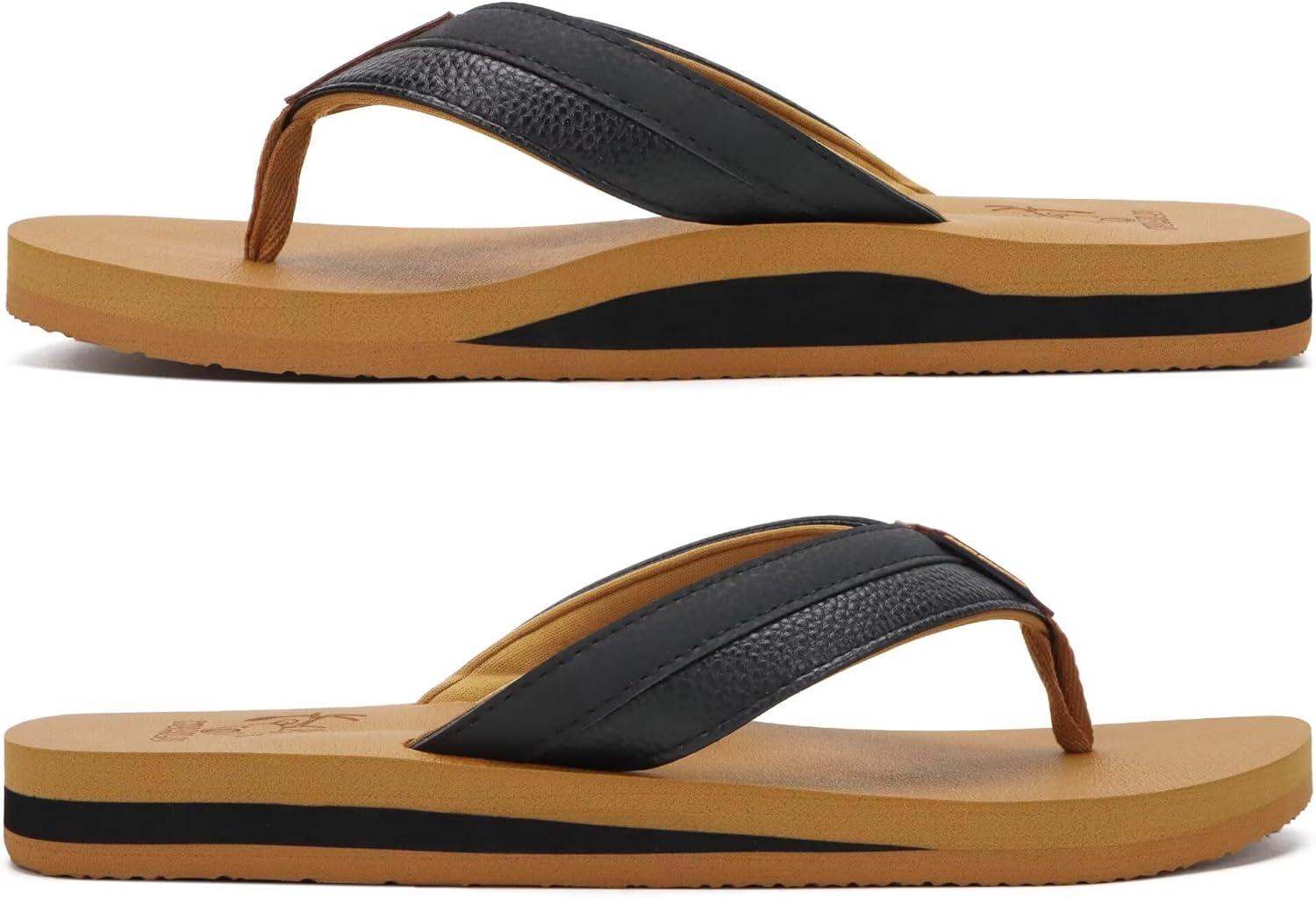 KuaiLu Men’s Yoga Mat Leather Flip Flops with Arch Support Comfortable Cushion Walking Thong Sandals Slip On Indoor Outdoor(Black Khaki)