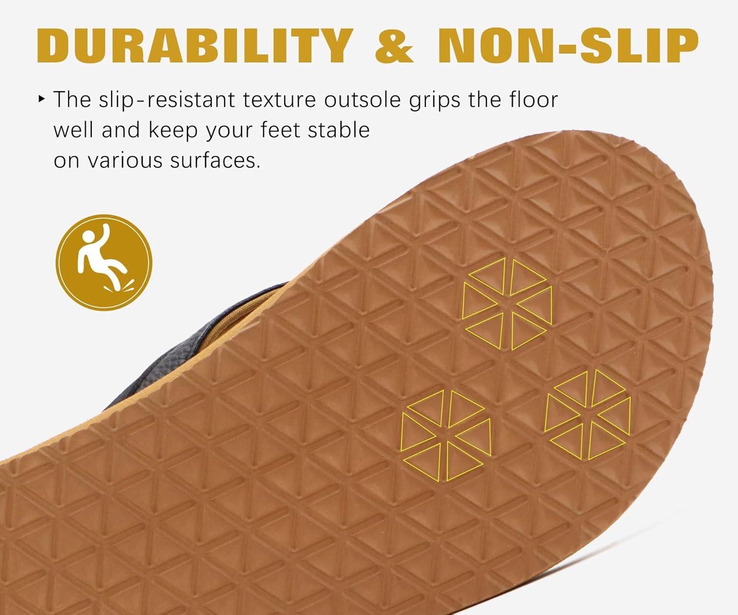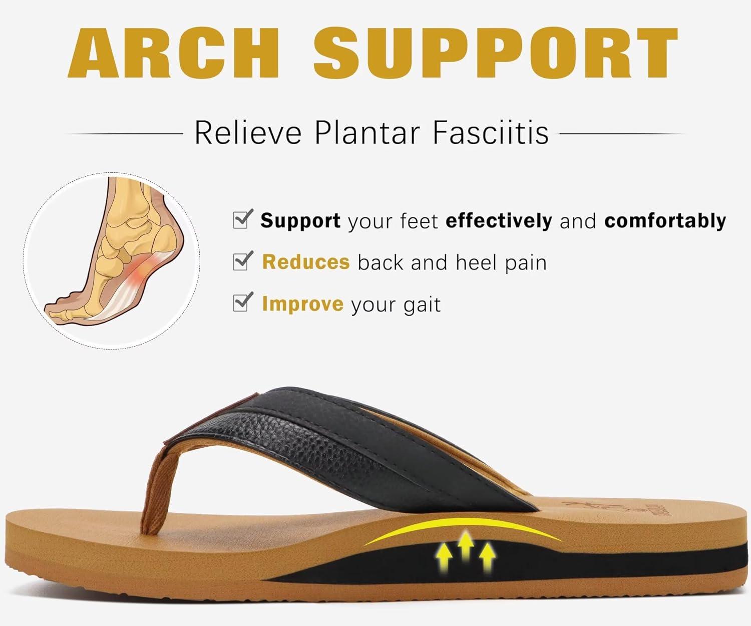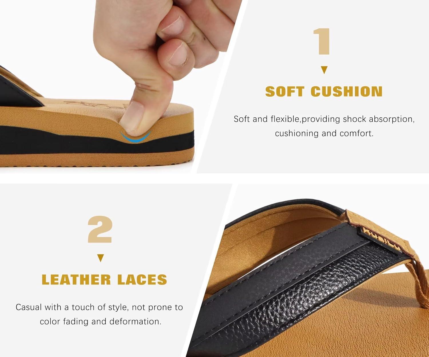 KuaiLu Men’s Yoga Mat Leather Flip Flops with Arch Support Comfortable Cushion Walking Thong Sandals Slip On Indoor Outdoor(Black Khaki)