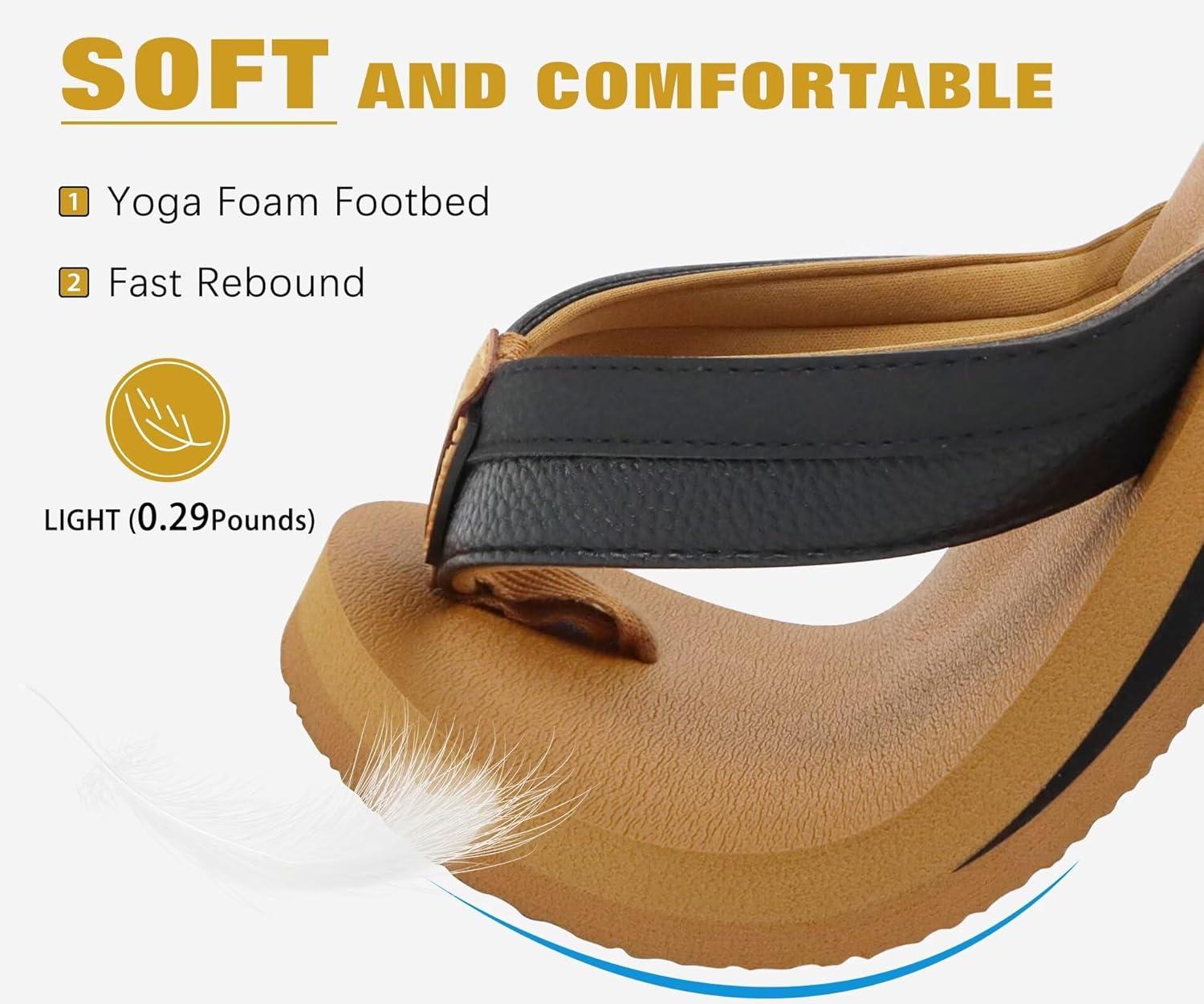 KuaiLu Men’s Yoga Mat Leather Flip Flops with Arch Support Comfortable Cushion Walking Thong Sandals Slip On Indoor Outdoor(Apricot)