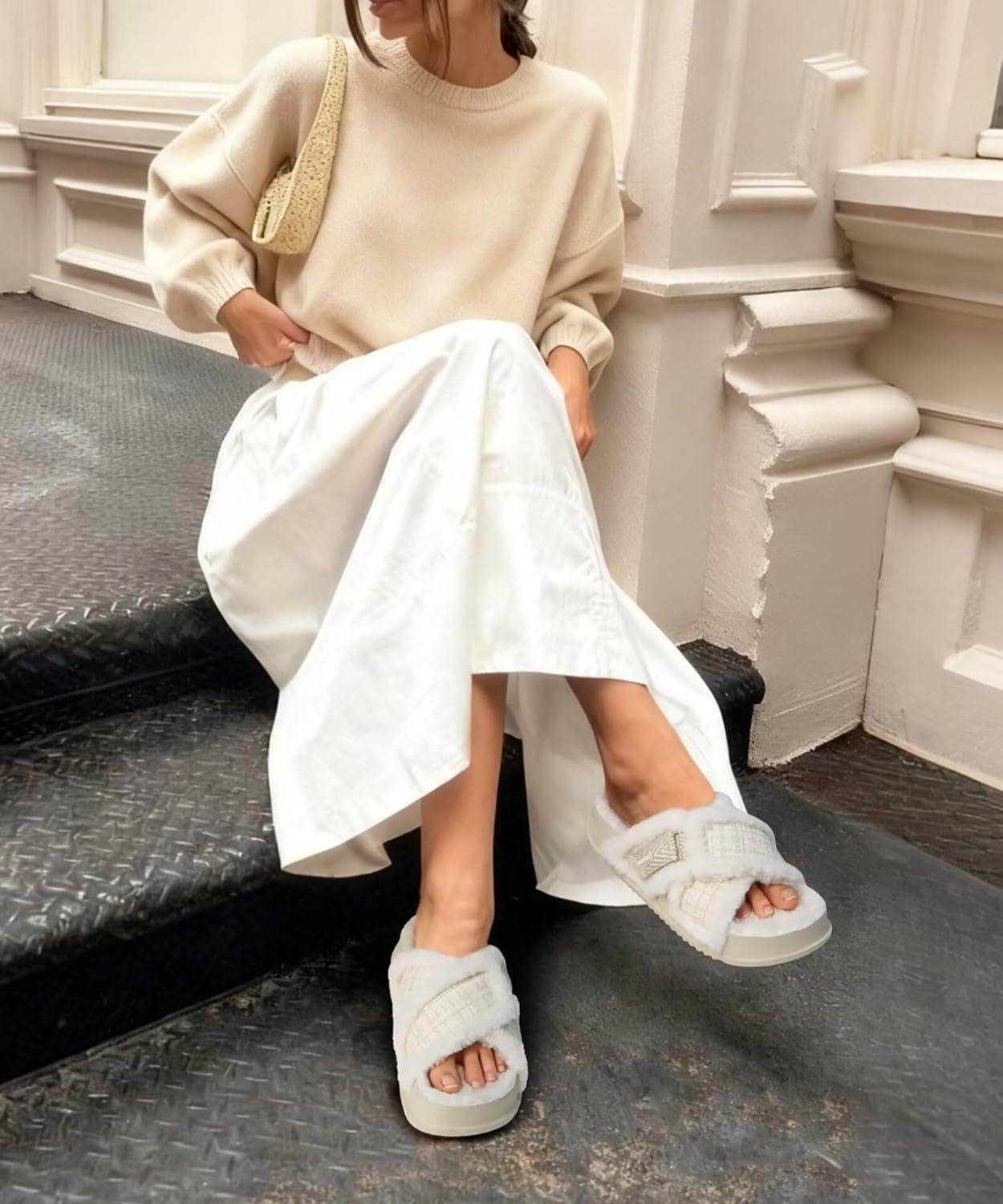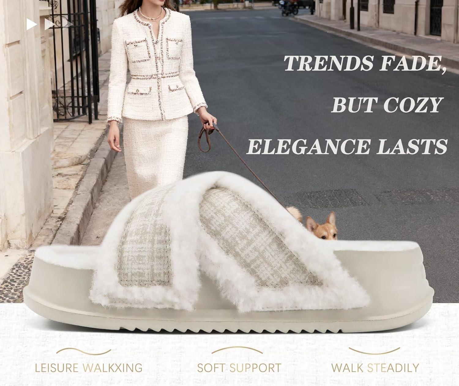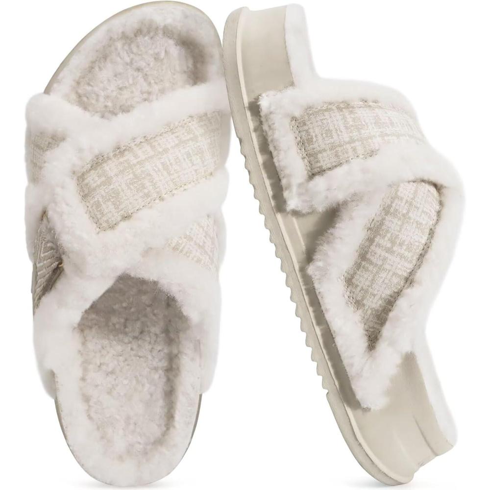 KuaiLu Women’s Chic Furry Platform Slippers Fuzzy Teddy Fleece Cross Band Open Toe Sandals with Comfortable Arch Support Slip on House Shoes Indoor Outdoor(Snow White)