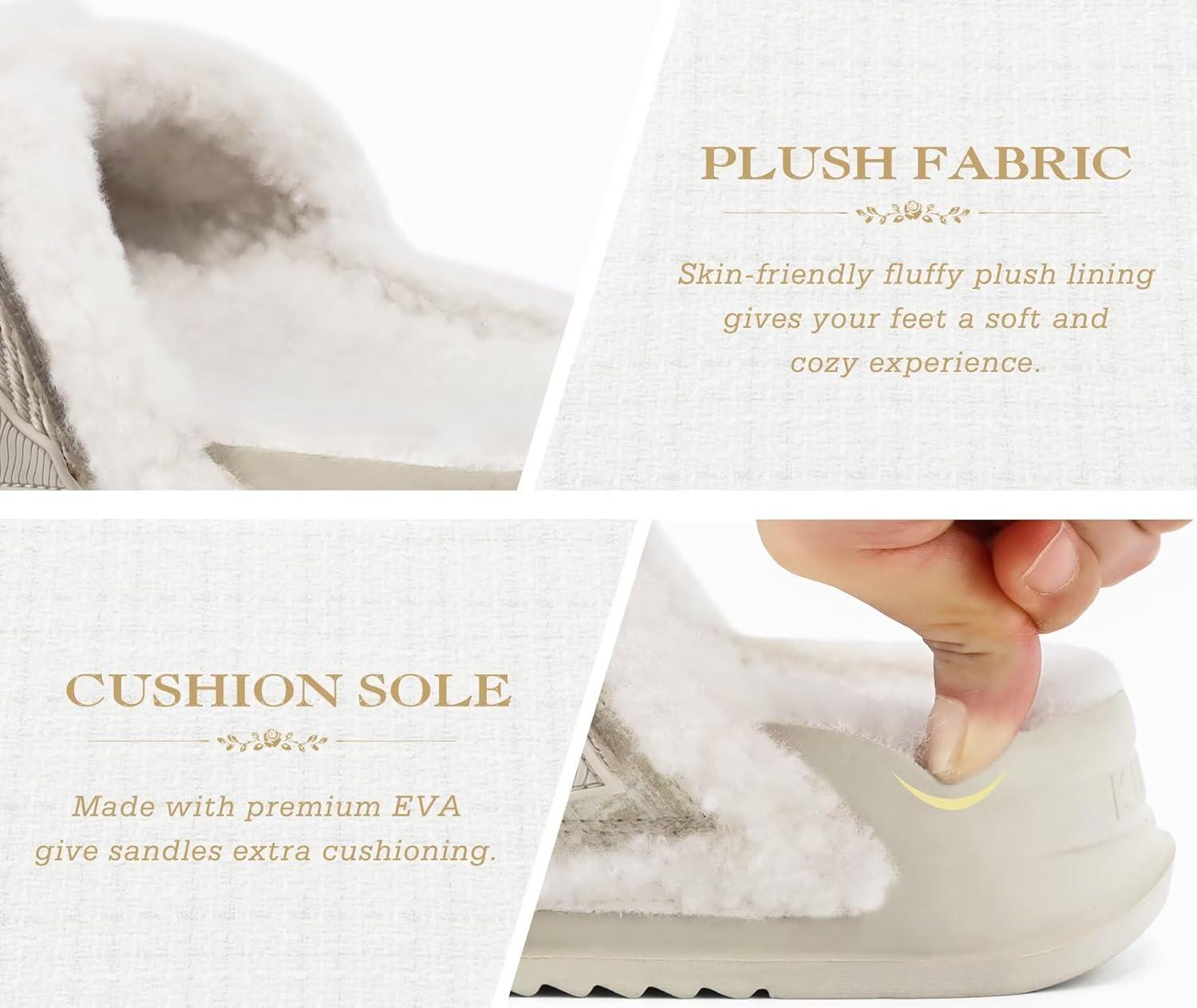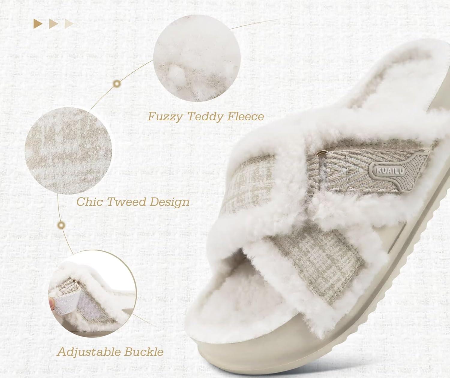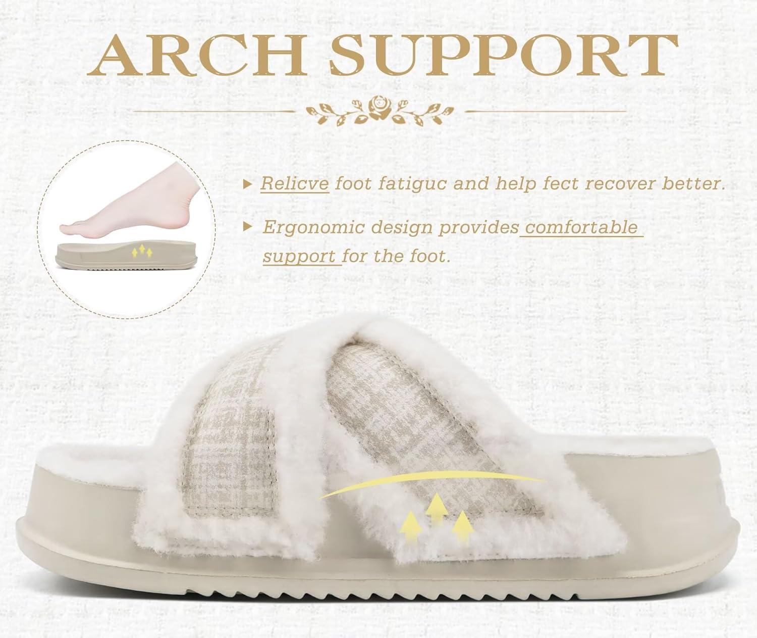 imageKuaiLu Womens Chic Furry Platform Slippers Fuzzy Teddy Fleece Cross Band Open Toe Sandals with Comfortable Arch Support Slip on House Shoes Indoor OutdoorLight Brown