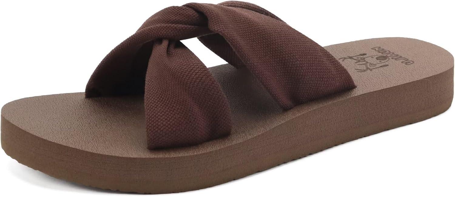KuaiLu Womens Dressy Sandals with Arch Support Yoga Mat Comfortable Cushion Walking Criss Cross Slides Summer Beach Slip On Indoor Outdoor Slippers(All Brown)