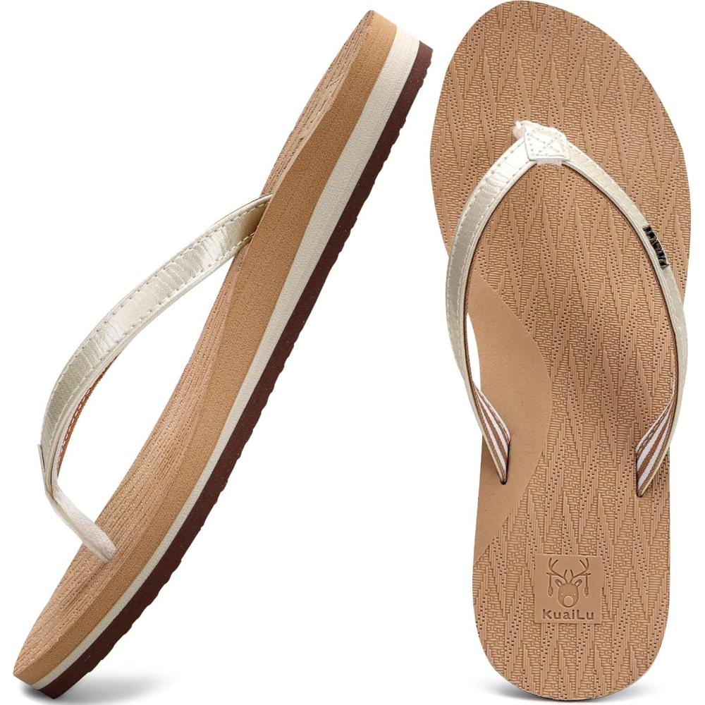 KuaiLu Womens Fashion Flip Flops Ladies Lightweight Summer Beach Yoga Mat Thong Sandals with Comfortable Arch Support(Shiny Beige)