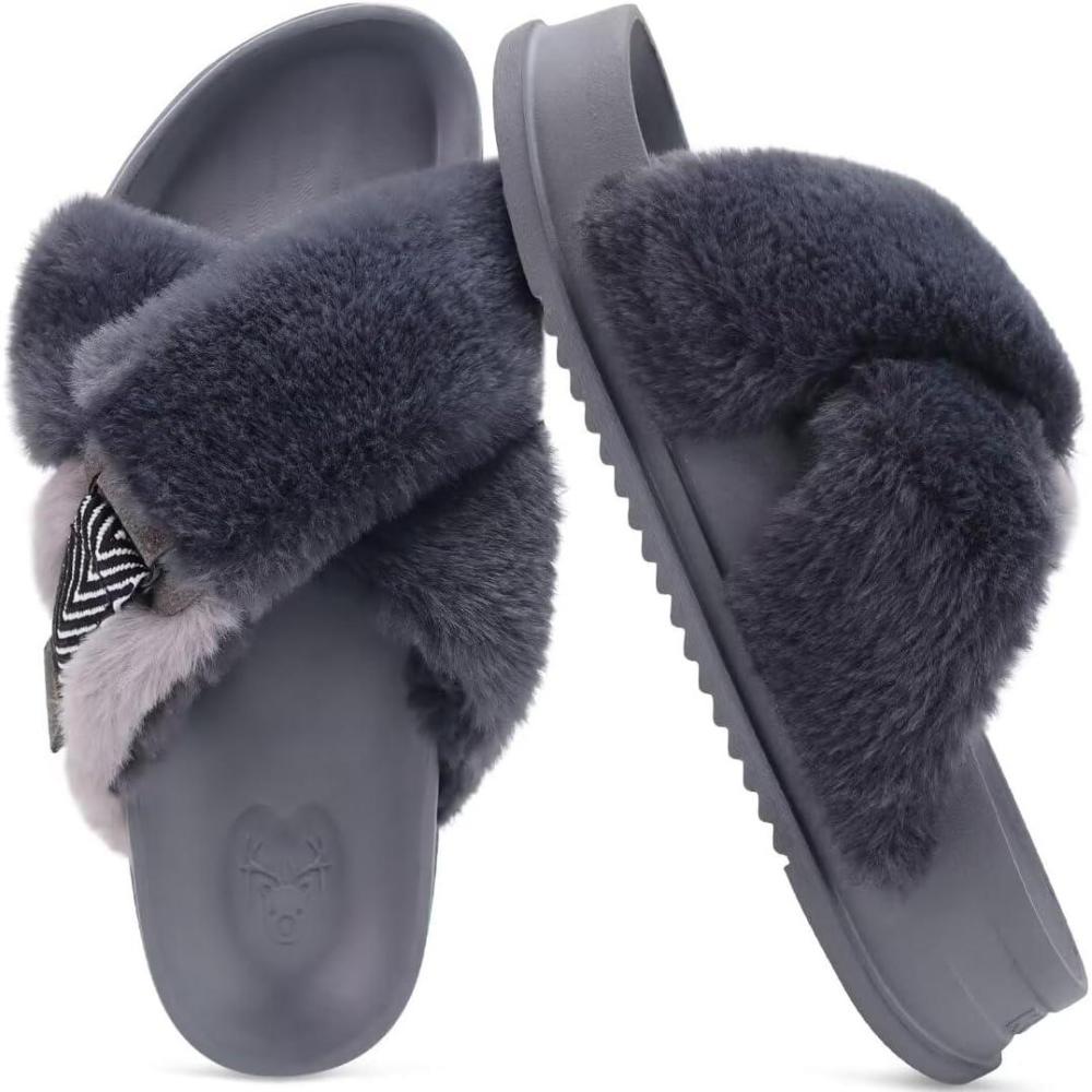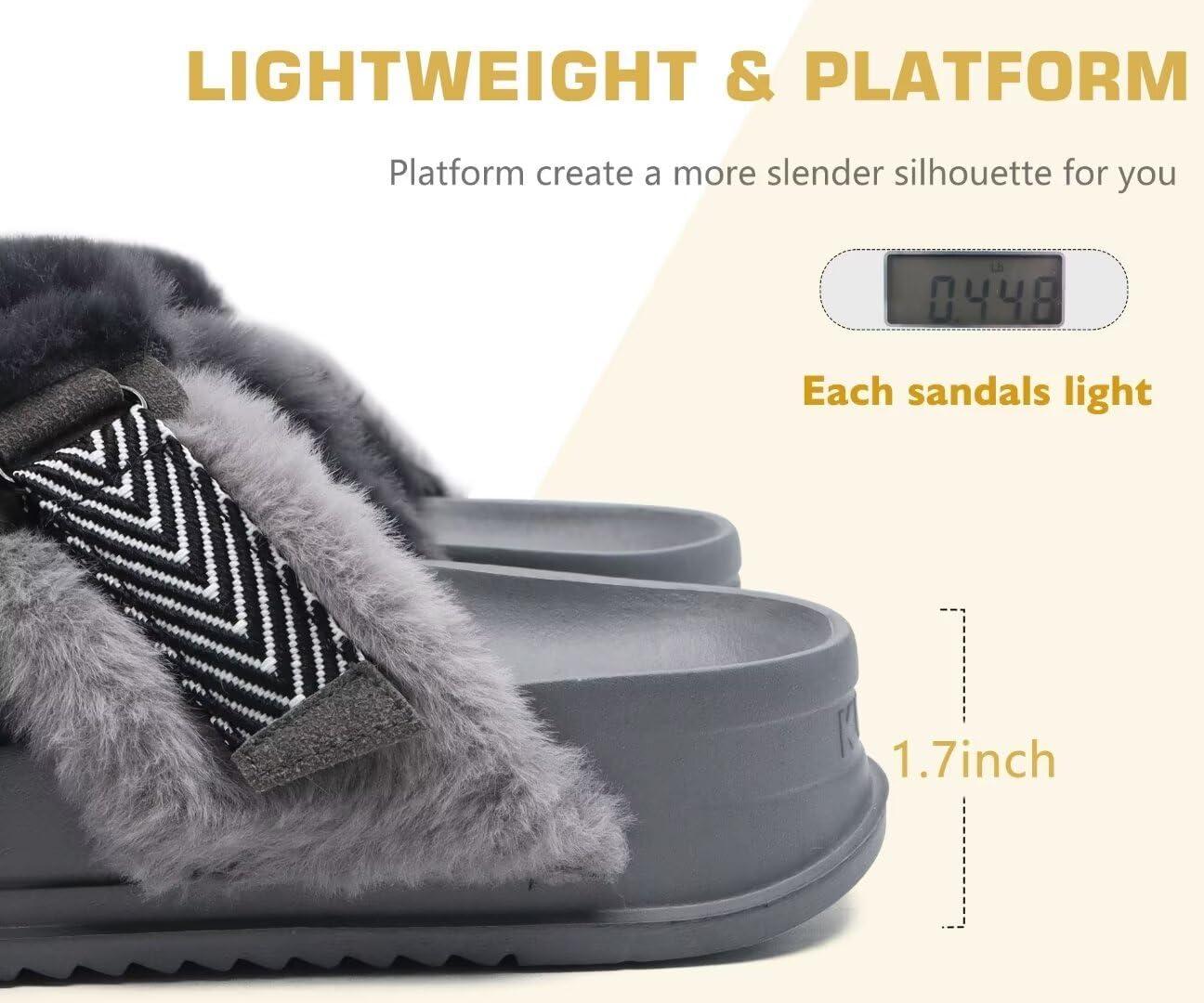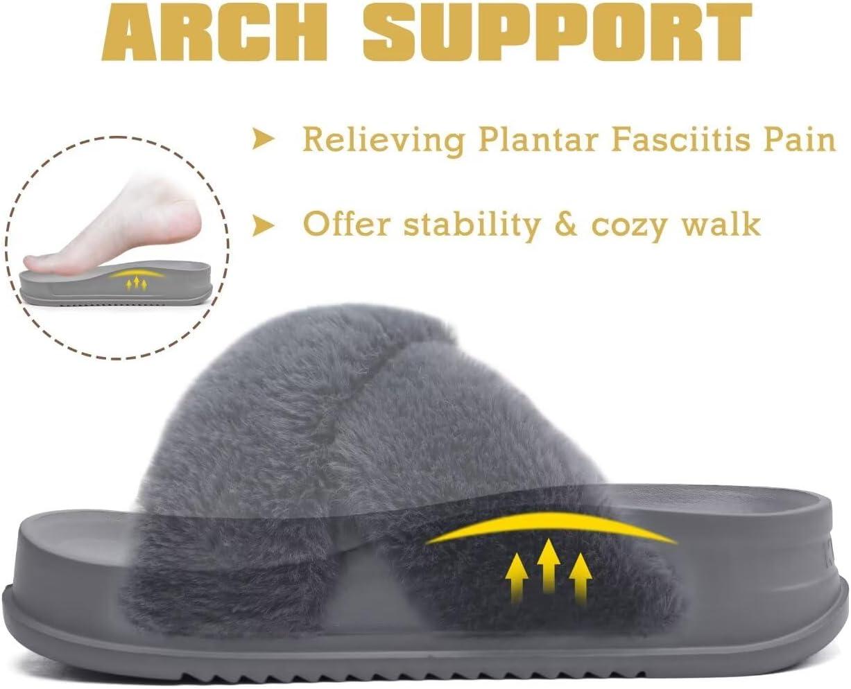 KuaiLu Women’s Fuzzy Cross Band Platform Slippers Furry Faux Fur Comfortable Arch Support Open Toe Slides for Indoor Outdoor(Grey)