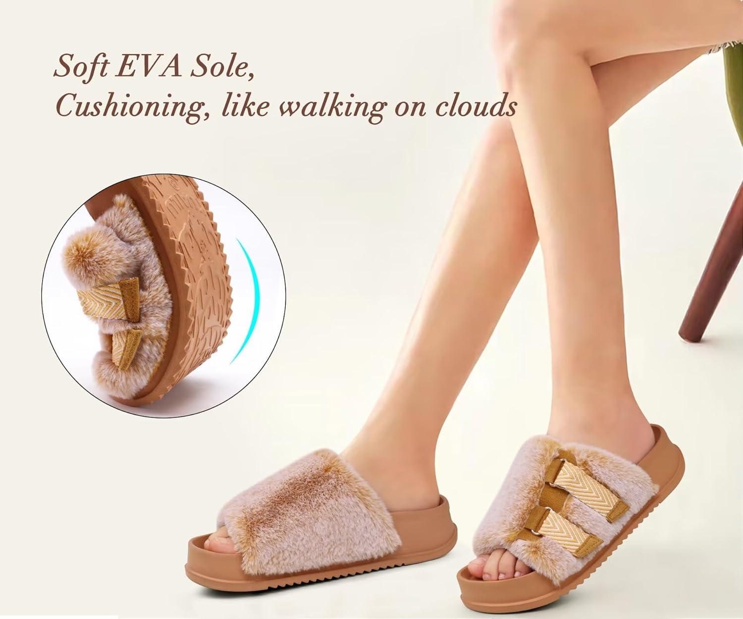 KuaiLu Womens Orthotic Sandals Comfortable Plantar Fasciitis Arch Support Faux Fur Sandal Slippers For Woman Adjustable Cushion Slides Slip On Indoor Outdoor Memory Foam House Shoes, Khaki Size 8