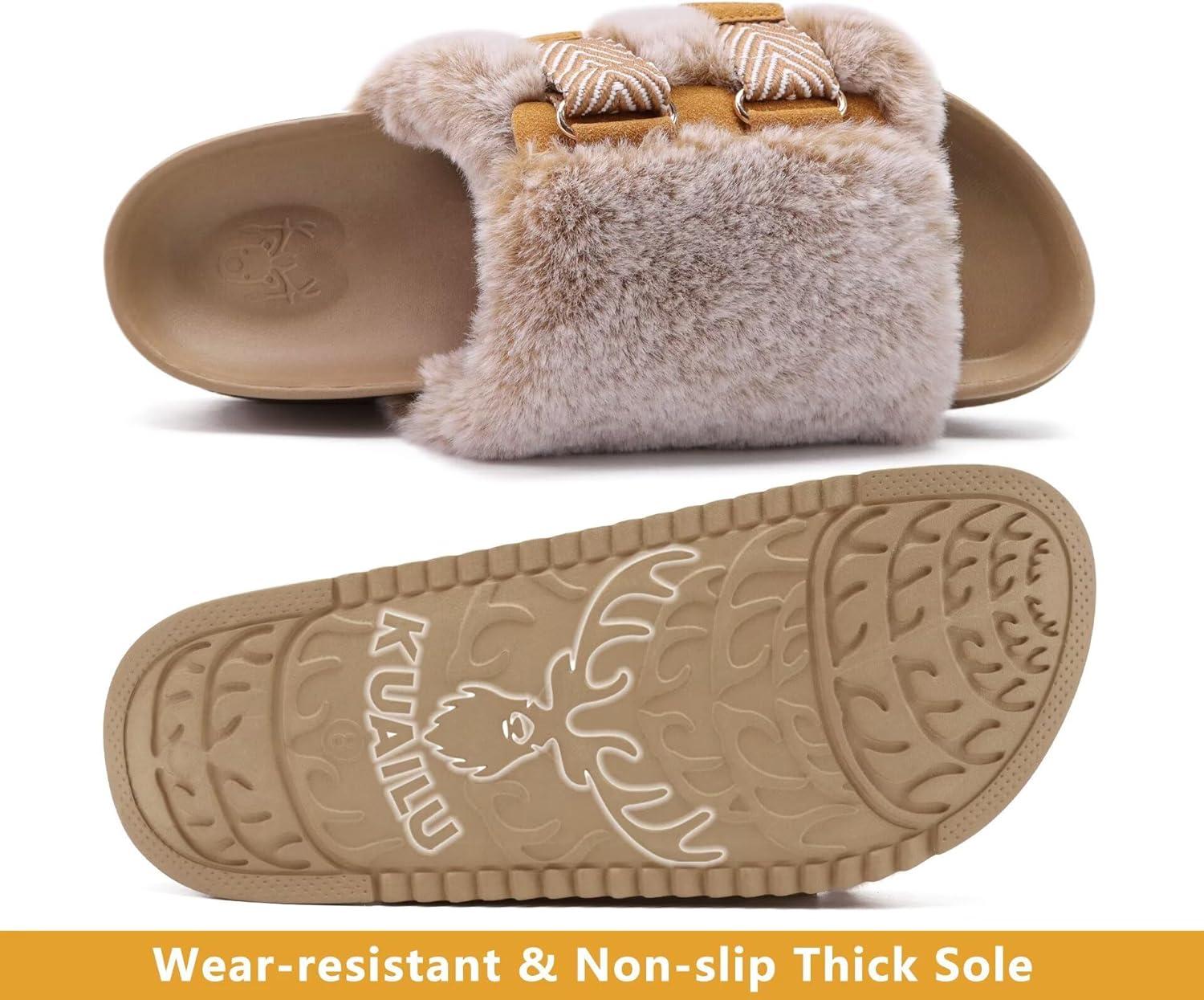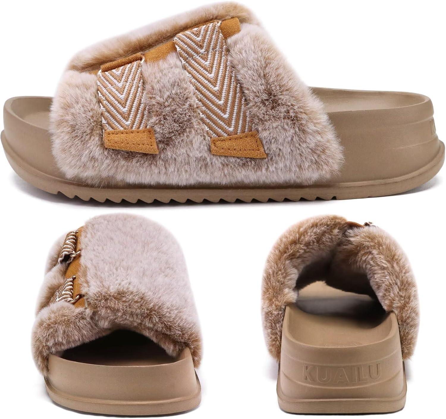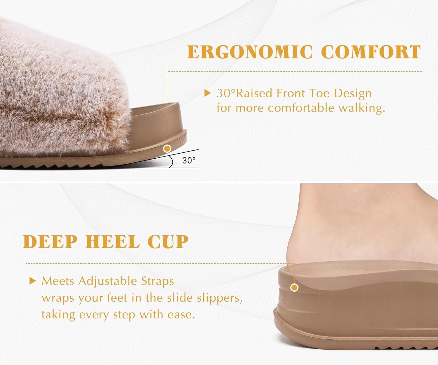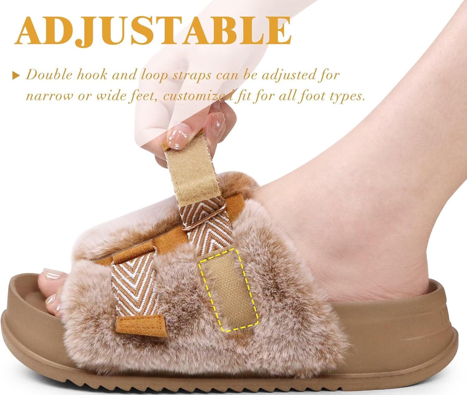 KuaiLu all-day comfort cushioning platform slippers are made from premium faux fur lined with soft and supportive EVA foam. Luxurious plush touch keeps you as warm as sitting by the fireplace in winter. Women's open toe slippers allow toes to breathe freely, keep them dry and give feet a comfortable environment. Adjustable design, also suitable for people with wide feet and high instep. Ergonomic footbed and non-skid indoor/outdoor rubber bottom are perfect no matter at home or go out for a walk. Fashionable color matching design is loved by ladies of all ages and perfect as a thoughtful gift for your loved ones on Birthdays, upcoming Thanksgiving Day, Christmas, New Year, Valentine's Day and Anniversaries.