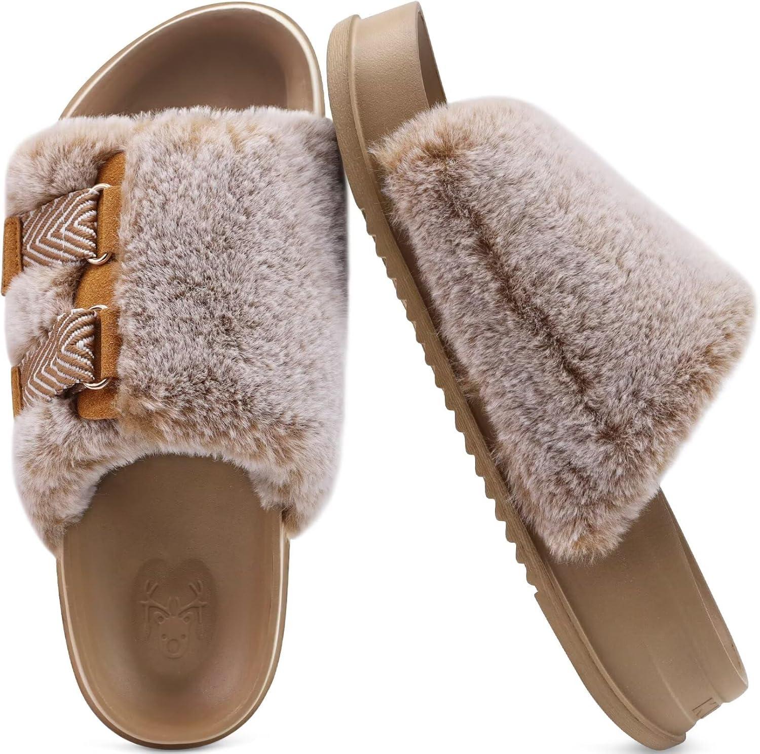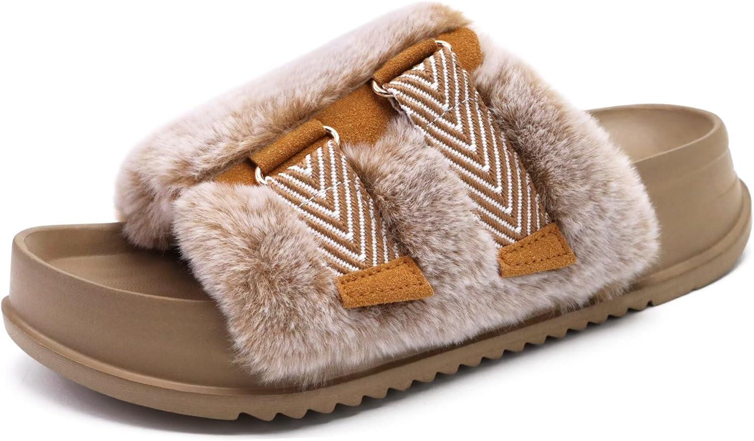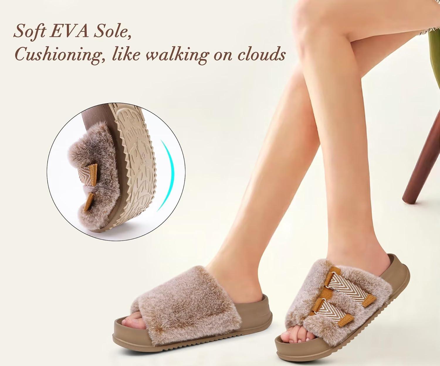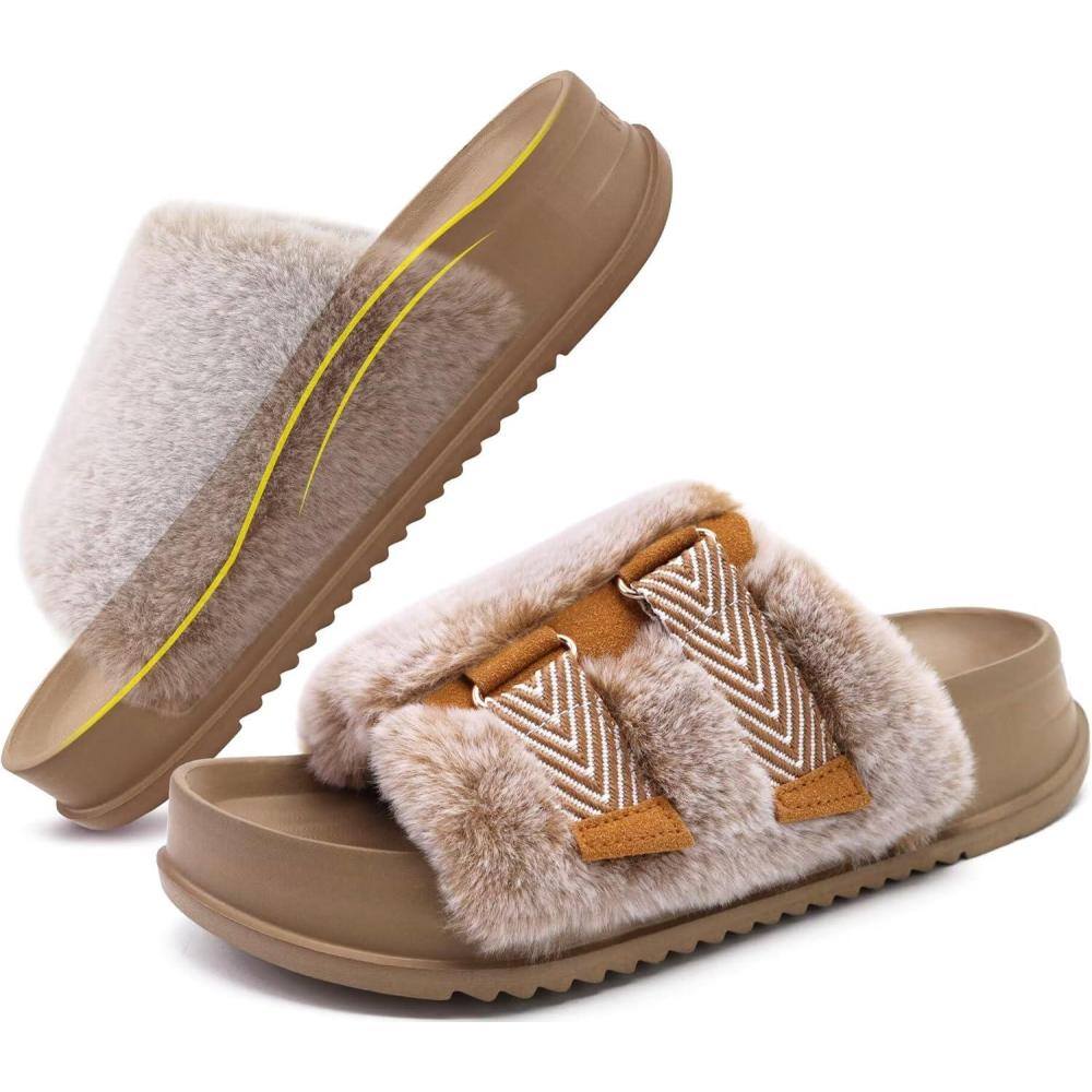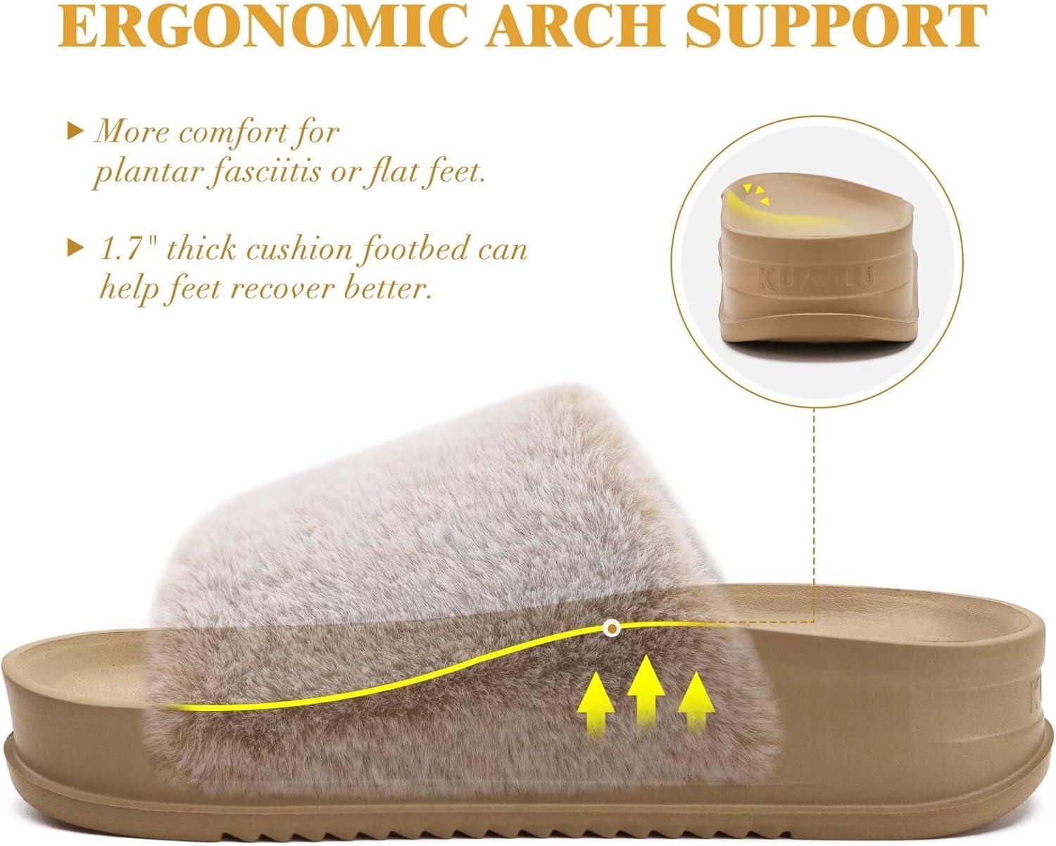 KuaiLu all-day comfort cushioning platform slippers are made from premium faux fur lined with soft and supportive EVA foam. Luxurious plush touch keeps you as warm as sitting by the fireplace in winter. Women's open toe slippers allow toes to breathe freely, keep them dry and give feet a comfortable environment. Adjustable design, also suitable for people with wide feet and high instep. Ergonomic footbed and non-skid indoor/outdoor rubber bottom are perfect no matter at home or go out for a walk. Fashionable color matching design is loved by ladies of all ages and perfect as a thoughtful gift for your loved ones on Birthdays, upcoming Thanksgiving Day, Christmas, New Year, Valentine's Day and Anniversaries.