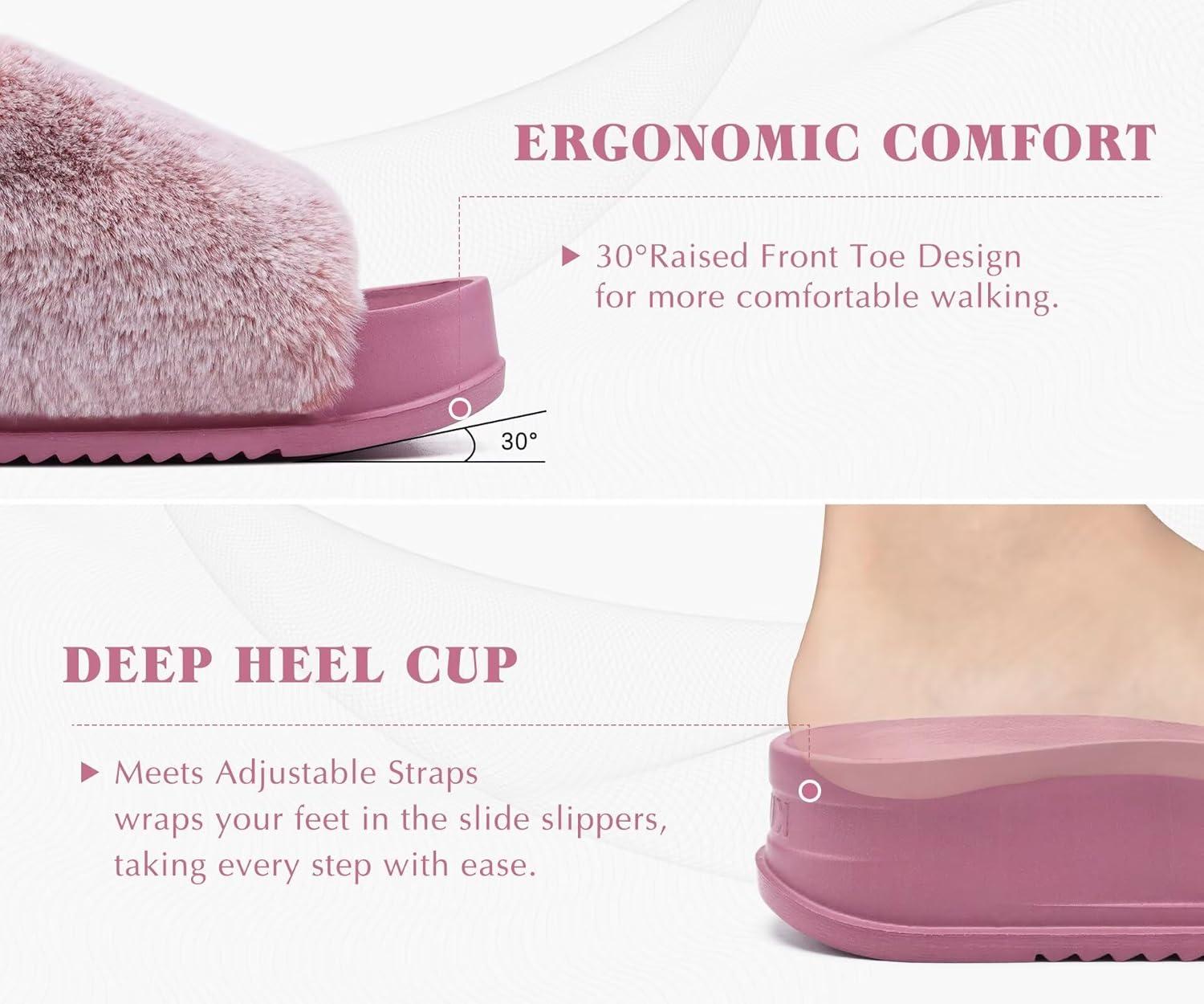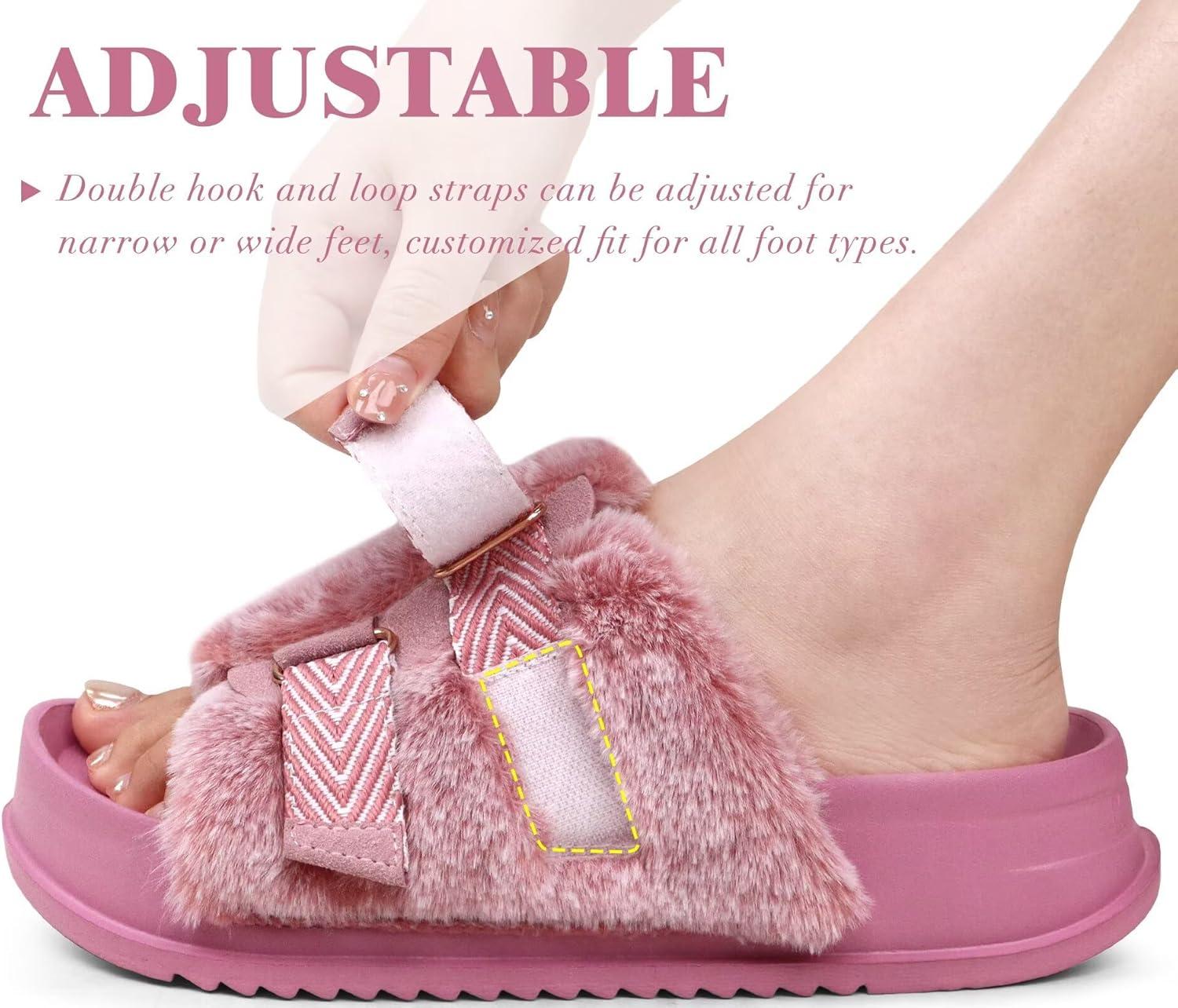 KuaiLu all-day comfort cushioning platform slippers are made from premium faux fur lined with soft and supportive EVA foam. Luxurious plush touch keeps you as warm as sitting by the fireplace in winter. Women's open toe slippers allow toes to breathe freely, keep them dry and give feet a comfortable environment. Adjustable design, also suitable for people with wide feet and high instep. Ergonomic footbed and non-skid indoor/outdoor rubber bottom are perfect no matter at home or go out for a walk. Fashionable color matching design is loved by ladies of all ages and perfect as a thoughtful gift for your loved ones on Birthdays, upcoming Thanksgiving Day, Christmas, New Year, Valentine's Day and Anniversaries.