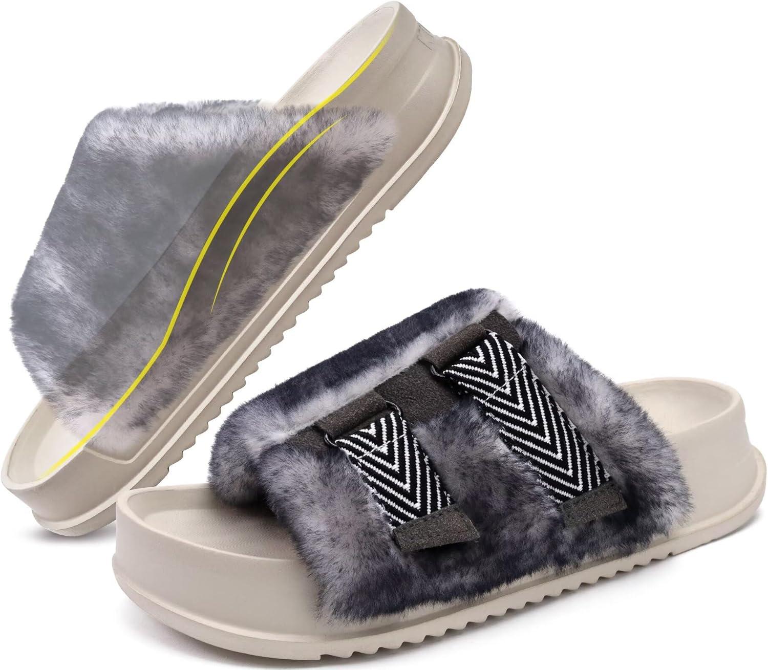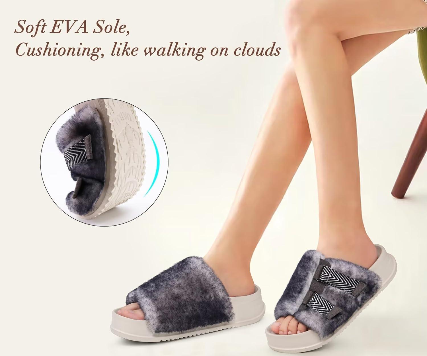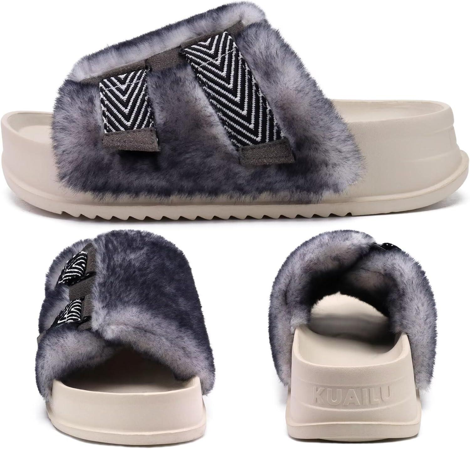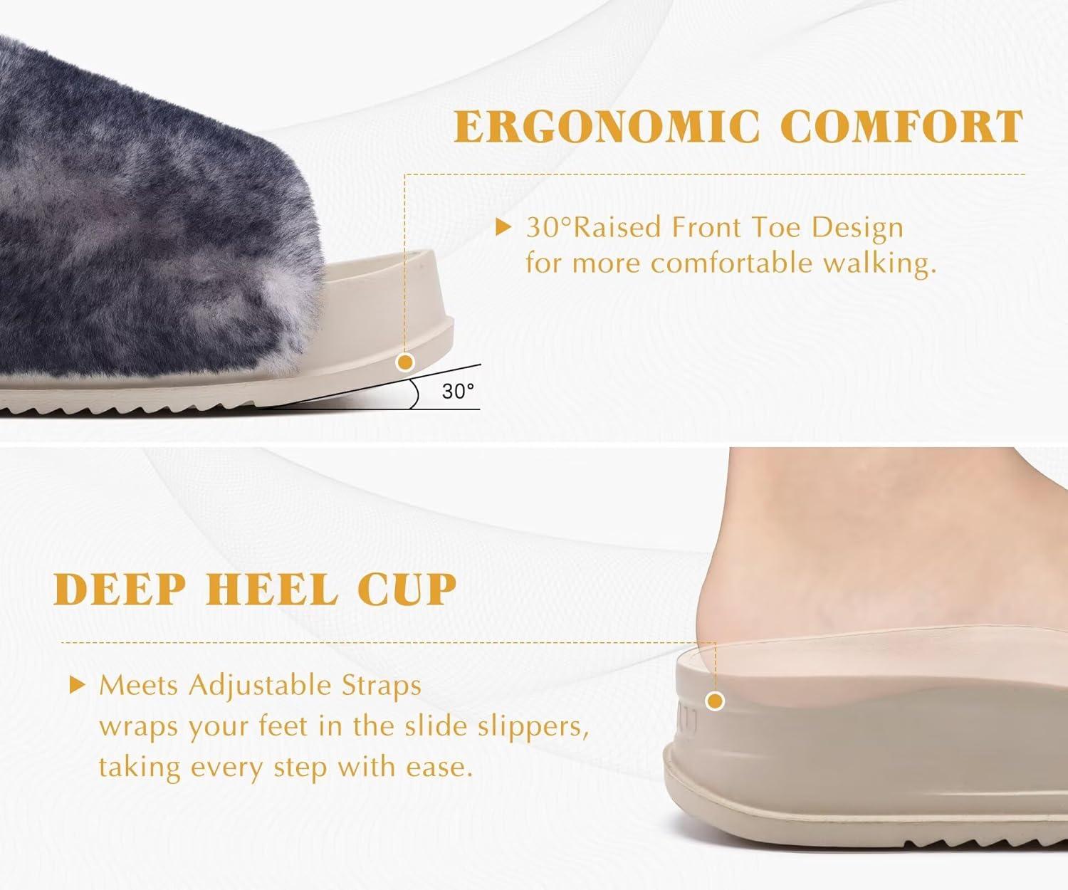 KuaiLu all-day comfort cushioning platform slippers are made from premium faux fur lined with soft and supportive EVA foam. Luxurious plush touch keeps you as warm as sitting by the fireplace in winter. Women's open toe slippers allow toes to breathe freely, keep them dry and give feet a comfortable environment. Adjustable design, also suitable for people with wide feet and high instep. Ergonomic footbed and non-skid indoor/outdoor rubber bottom are perfect no matter at home or go out for a walk. Fashionable color matching design is loved by ladies of all ages and perfect as a thoughtful gift for your loved ones on Birthdays, upcoming Thanksgiving Day, Christmas, New Year, Valentine's Day and Anniversaries.