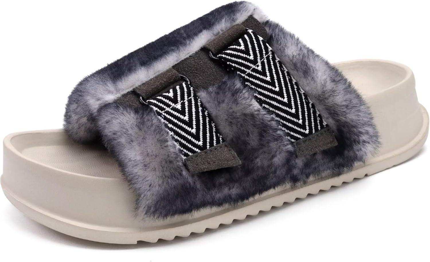 KuaiLu Women’s Orthotic Slippers With Arch Support Soft Cushion Sandal Slippers for Woman Ladies Fashion Open Toe Faux Fur Platform Slipper Indoor Outdoor 6~12(White Black (Adjustable))